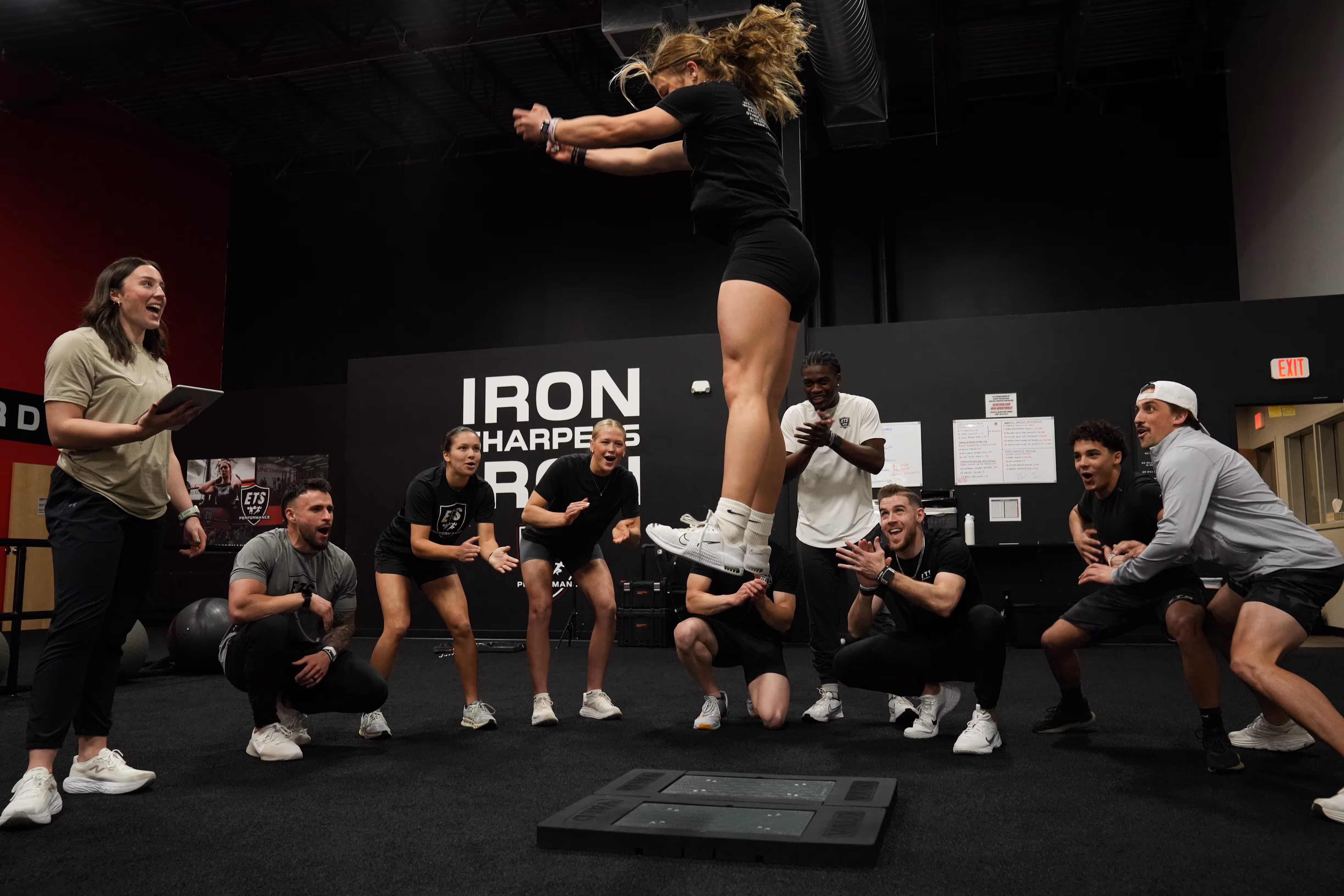 Timed reps and jump metrics with periodic re-tests.